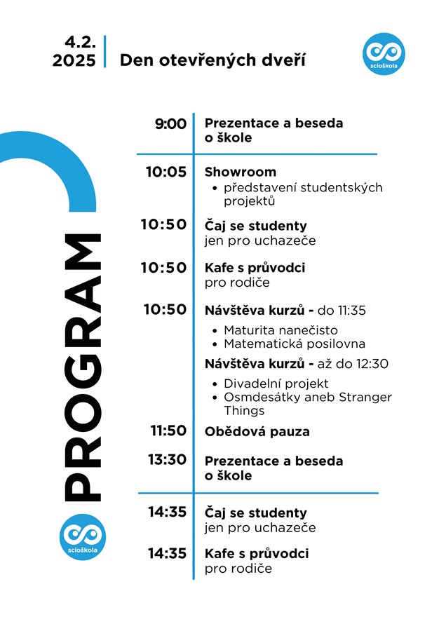 Na programu bude kromě prezentace školy a besedy se studenty nebo s rodiči také možnost navštívit kurzy vedené průvodci a jedinečná příležitost vidět představení studentských projektů v rámci tzv. showroomu. Prosím respektujte začátky jednotlivých bloků. Prezentace začíná tentokrát již 9 hod.